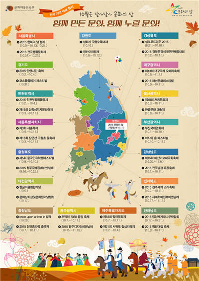 부산국제영화제(부산, 10. 1.~10.), 대구국제오페라축제(대구, 10. 8.~11. 7.), 광주디자인비엔날레(광주, 10. 15.~11. 13.) 등 유명 축제가 전국 곳곳에서 펼쳐진다. 또한 정선 아리랑제(정선, 10. 9.~12.), 천안흥타령 춤축제(천안, 10. 7.~11.), 처용문화제(울산, 10. 8.~11.), 광주세계김치축제(광주, 10. 24.~28.), 전주 세계소리축제(전주, 10. 7.~11.), 명량대첩 축제(해남, 10. 9.~11.) 등 지역 고유문화를 소재로 한 축제가 각 시·도의 대표행사로 진행된다.