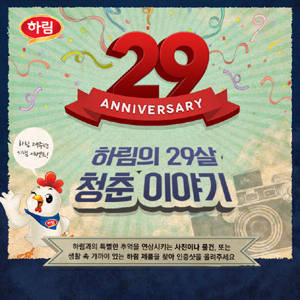닭고기 전문기업 하림이 자사의 창립 기념일(10월 11일)을 맞아 소비자와 재미있게 소통할 수 있는 '하림의 29살 청춘 이야기' 이벤트를 5일부터 11일까지 하림 페이스북, 카카오스토리채널, 블로그를 통해 진행한다. 이번 이벤트는 1986년 창립된 이래 지난 29년 동안 하림이 소비자들과 나눴던 다양한 추억들을 한 자리에서 공유하기 위해 마련됐다.