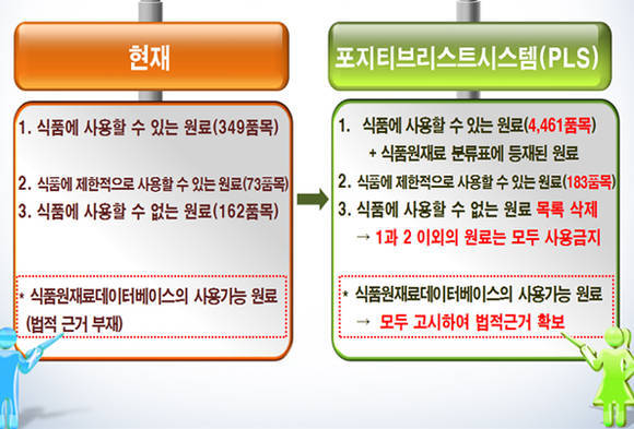 식약처는 사용가능·제한적 사용·사용 불가능 원료 3개 분야로 나눠져 있는 현행 식품원료 관리체계를 식품에 사용가능하거나 제한적으로 사용할 수 있는 원료 중심의 포지티브리스트시스템(Positive List System, PLS)으로 전환할 계획이다.