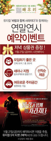 오는 27일까지 사전 예약하는 고객을 대상으로 ‘저녁 상품권 무료 증정’ 행사와 함께 뮤지컬 '바람과 함께 사라지다' S석 티켓을 1인 2매씩 증정한다. 당첨자 발표는 내달 1일 있을 예정이다.