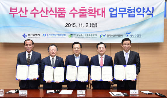 한국농수산식품유통공사(aT, 사장 김재수)는 국내 수산식품 약30%를 수출하는 수출 메카인 부산시와 수협중앙회, 한국수산무역협회 및 해양수산산업 상생협력추진단(해양수산부ㆍ대한상공회의소)과 2일 부산시청에서 수출확대와 수출시장 다변화를 위한 업무협약(MOU)을 체결했다.
