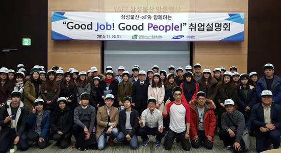 aT는 자체적으로 운영중인 대한민국 농식품 미래기획단, 얍(YAFF:Young Agri-Food Fellowship) 회원 70여명과 함께 27일 삼성물산(서울 서초 소재)을 방문해 삼성물산의 기업 및 주요사업, 인재상, 채용프로세스 등 취업설명을 해당기업 인사담당자로부터 직접 듣는 기회를 가졌다.