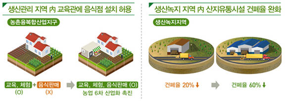 이번에 의결된 시행령 개정안의 주요내용은 다음과 같다. 건폐율 규제개선을 통해 기존공장 증축 허용, 빵, 떡 제조업소 바닥면적 규제 완화, 생산관리지역 내 교육관에 음식점 설치 허용, 생산녹지지역 내 농산물 산지유통시설 건폐율 완화 등이다.