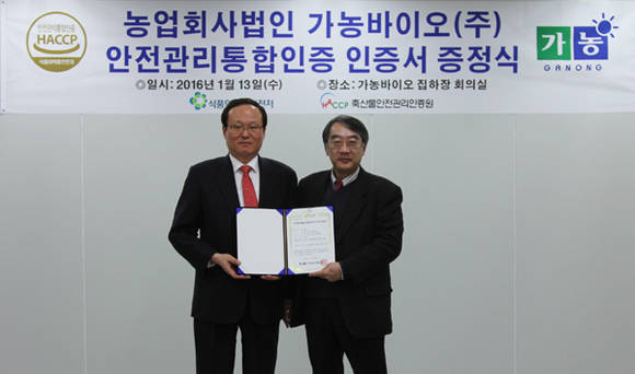 축산물안전관리인증원(이하 인증원) 김진만 원장은 13일 포천시 가산면의 가농바이오 G.P센타를 방문해 통합인증서 증정식을 갖고 유재흥 대표에게 직접 전달했다.