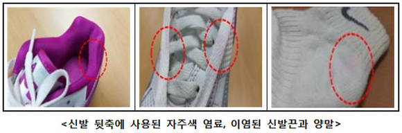 한국소비자원(원장 한견표)은 17일 나이키 자주색 AIR MAX 여성용 운동화에서 염료가 묻어난다는 사례를 소비자위해감시시스템(CISS)을 통해 접수하고 조사를 실시했다고 밝혔다.시중 유통 중인 동일 모델 운동화를 구입해 신어본 결과, 약 8시간 만에 자주색으로 염색된 뒷축 원단으로부터 염료가 양말이나 신발끈에 이염되는 것을 확인했다.