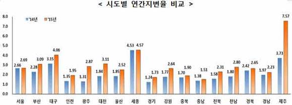 전국 17개 시‧도 땅값이 모두 상승한 가운데, 수도권 2.19%보다 지방이 2.77%로 상승 폭이 컸다.