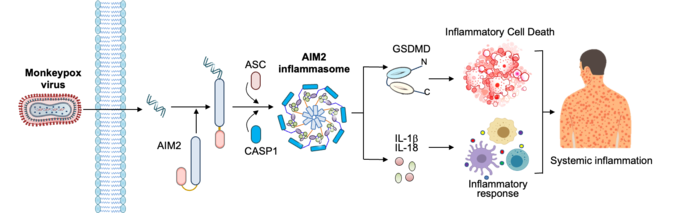 이번 연구를 통해 AIM2가 외부에서 침입한 원숭이두창바이러스의 DNA를 인식하는 센서 역할을 하는 것을 확인했으며, 바이러스 DNA를 인식해 활성화된 AIM2는 염증 소체(inflammasome)를 형성하고, 이 염증 소체가 다시 카스파제-1(caspase-1) 효소를 활성화하면서 세포가 파괴되고, 염증 신호 물질(IL-1β, IL-18)이 과다하게 분비된다.