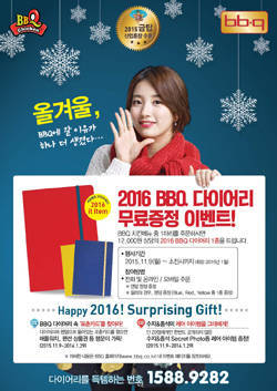 뿐만 아니라 2016 BBQ 다이어리에는 BBQ 광고 모델인 수지와 이종석의 독점화보가 삽입돼 더욱 소장가치가 있으며 추후 응모이벤트를 통해 단 20명 에게만 수지와 이종석의Secret Photo 등 희귀 아이템을 제공한다.