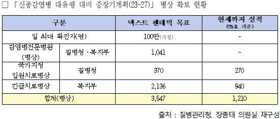 질병관리청, 목표 3,547병상 중 1,210병상 확보 그쳐