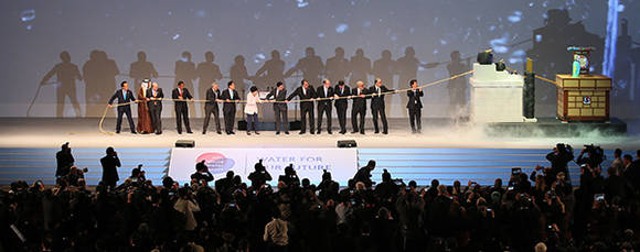 조직위에 따르면 지난 12일 열린 '제 7차 세계 물포럼' 개막식에서 박근혜 대통령 등 각국 주요 참석자들이 행사 시작을 알리는 '줄 당기기' 퍼포먼스를 하던 중 높이 2m 짜리 구조물이 넘어지는 사고가 발생했다.