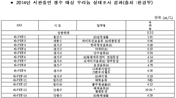 국회 환경노동위원회 한정애 새정치민주연합 의원이 환경부로부터 제출받은 자료에 의하면 2014년 생수를 판매중인 제조업체 53개소를 대상으로 전수 조사한 결과 해태음료와 이동장수샘물의 2개 업체에서 우라늄이 발견됐다.