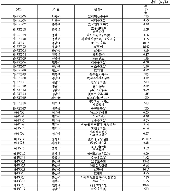 특히, 경기 소재 이동장수샘물은 국제기준치의 5.4배에 달하는 162.11㎍/L의 우라늄이 검출됐으며 해태음료 철원공장의 경우 우라늄 함유가 39.26㎍/L로 역시 국제기준 30㎍/L를 넘었다.