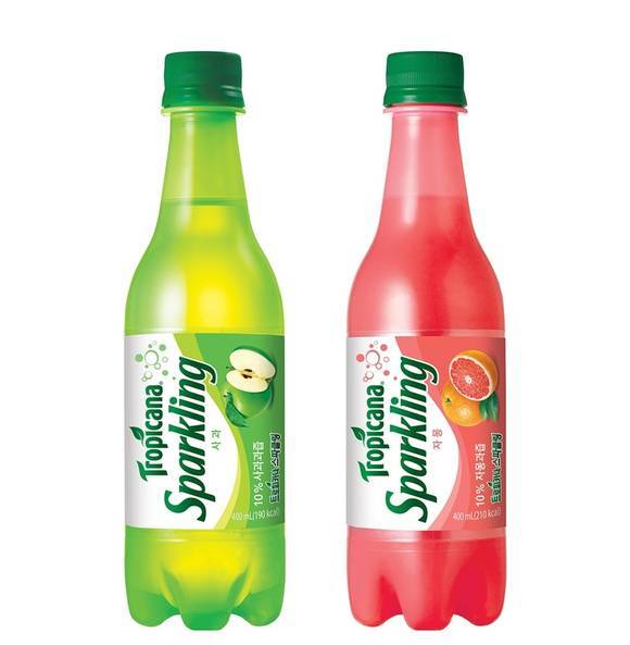 기존 355ml 캔으로 판매중인 트로피카나 스파클링 사과, 오렌지, 포도, 복숭아. 망고 총 5종에서 가장 인기가 많은 사과와 새로운 맛인 자몽을 더해 롱넥보틀로 새롭게 선보였다.