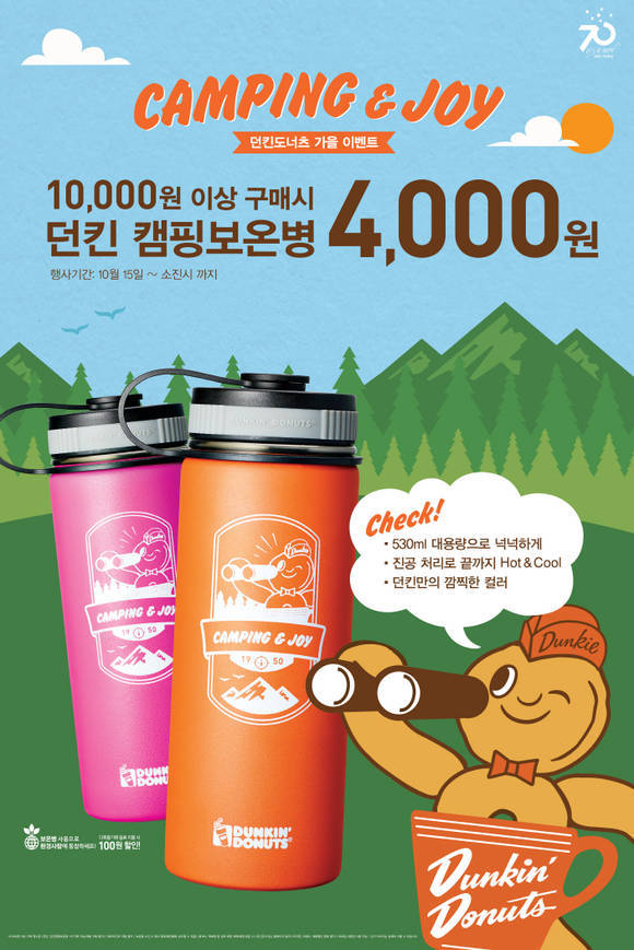 이번 ‘캠핑 보온병’ 프로모션은 던킨도너츠 제품 10,000원 이상 구매 시 던킨도너츠의 톡톡 튀는 시그니처 컬러와 브랜드 캐릭터가 들어간 캠핑 보온병을 4,000원에 구매할 수 있는 행사다.