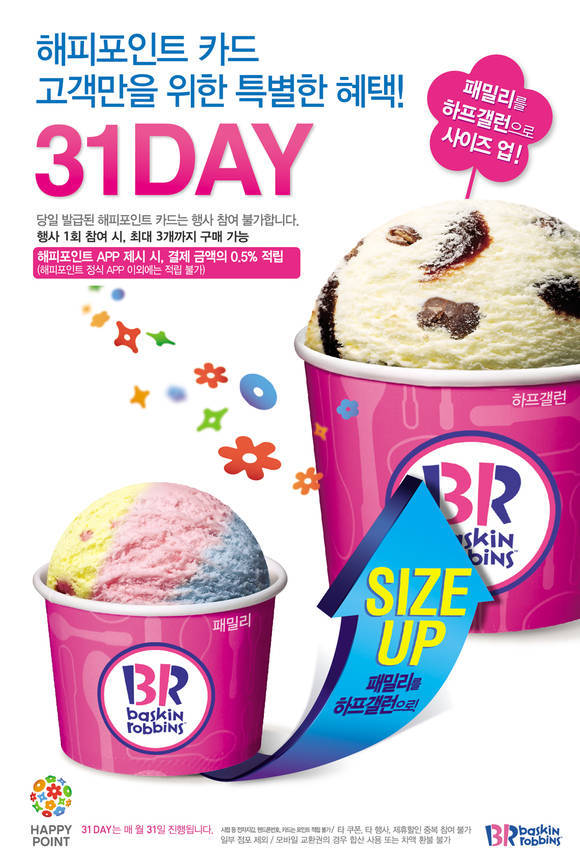 이번 행사는 배스킨라빈스 전국 매장에서 사용할 수 있는 해피포인트 카드 및 공식 애플리케이션을 제시하면 누구나 ‘31DAY’의 특별한 혜택을 받을 수 있다.