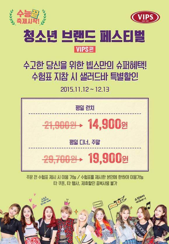 이와 함께 오는 15일까지 소셜커머스 쿠팡, 위메프와 제휴해 수험생을 위한 ‘빕스 치어업(Cheer up) 세트’를 판매한다. ‘빕스 1997스테이크’(샐러드바 1인 포함)와 ‘애플망고 에이드’ 1잔으로 구성한 세트 메뉴로 정상가의 35% 할인 적용한 가격으로 구매할 수 있다.