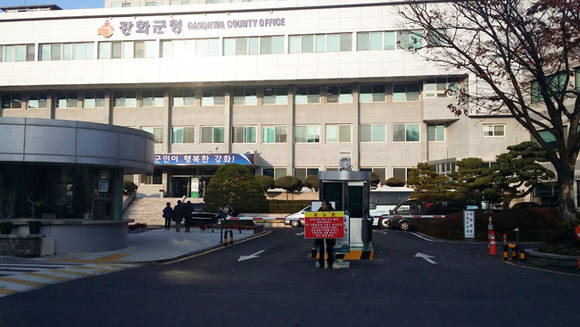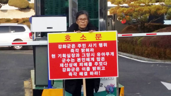 10일 인천시 강화군청 앞에서 윤정남씨가 1인시위를 하고 있다.