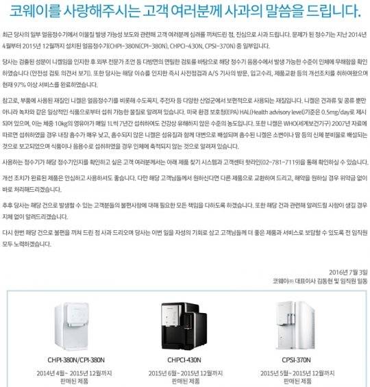 이날 코웨이 측은 “문제가 된 정수기 중 97%는 수리를 완료했다 올해 1월부터는 니켈 성분이 없는 부품으로 교체했다”면서 “그렇지만 고객이 원하면 다른 제품으로 바꿔주거나 해약을 원하면 위약금 없이 처리할 것”이라고 말했다.