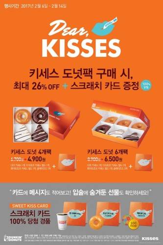 던킨도너츠는 키세스 도넛팩 구매자에게 100% 당첨 경품 스크래치 카드도 증정한다. 카드는 펄레드 컬러에 입술 모양 스크래치가 새겨진 디자인으로, 밸런타인 카드로도 사용할 수 있다.