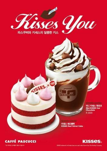 파스쿠찌는 미국 초콜릿 전문회사 허쉬의 키세스 초콜릿을 활용한 음료 1종과 케이크 1종을 선보인다.