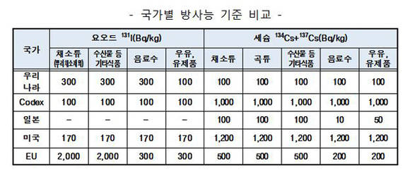방사능 검사는 요오드(131I), 와 세슘(134Cs+137Cs)을 검사하는데, 식품의 방사능 기준은 우리나라 및 EU의 경우 일본산 수입제품에 대해서는 일본 기준을 적용하고 있으며, 2013년 9월 식약처 특별조치로 모든 식품의 세슘 기준이 370Bq/kg에서 100Bq/kg로 강화됐다.