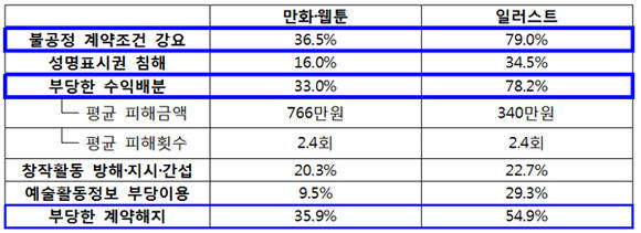 불공정 경험 중에는 불공정 계약조건을 강요당한 경우가 만화·웹툰과 일러스트 양 분야에서 모두 가장 높게 나타났다. 특히 일러스트의 경우에는 불공정한 계약조건 강요 경험비율이 79.0%로(만화·웹툰은 36.5%) 다른 유형에 비해 압도적으로 높은 비율로 나타났다.