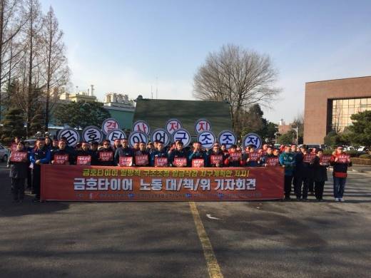 금호타이어 노동대책위원회는 15일 광주공장 앞에서 기자회견을 열고 “채권단과 경영진이 제시한 정상화 계획은 구성원의 고혈을 짜내려는 철 지난 계획에 불과하므로 단호히 거부한다”고 주장했다.