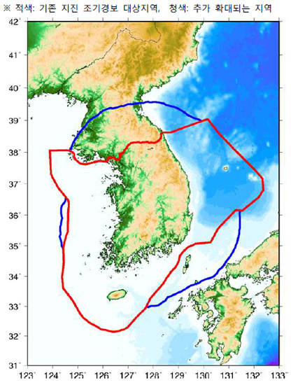 확대되는 지진 조기경보 대상 영역은 국내에 영향을 줄 수 있는 지진이 발생하는 구역으로 ▲북쪽으로는 휴전선 북쪽 평양 인근과 ▲남동쪽으로는 일본 규슈 북쪽 대마도 일대를 포함한다.