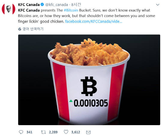 한편, 블록체인 전문매체인 비트코인 뉴스는 KFC 캐나다가 제한된 시간에 한정수량의 치킨을 비트코인을 받고 판매한다고 보도했다. KFC는 ‘비트코인 버킷(The Bitcoin Bucket)’이라는 치킨 상품을 이달 12일(미국 기준)부터 19일까지 일주일간 진행하며 오후 5시부터 오후 8시까지 배달한다.