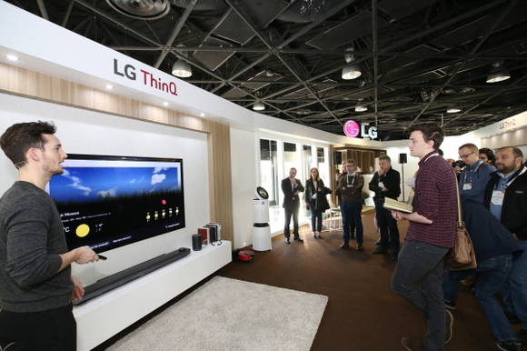 LG전자는 ‘LG 씽큐 존’에 거실, 세탁실, 주방 등의 생활 공간을 연출하고 인공지능 기술을 탑재한 제품들을 전시해 방문객들이 인공지능 제품들과 함께 하는 일상생활을 체험할 수 있도록 했다.