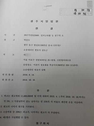 일심에서 광주지방 법원 판사 박근정판사가 일천백사십만원을 가수 박진에게 지급하라고 2018년 10월 18일에 판결했으나 불복해 광주고등법원에 항소를 준비 중이다.