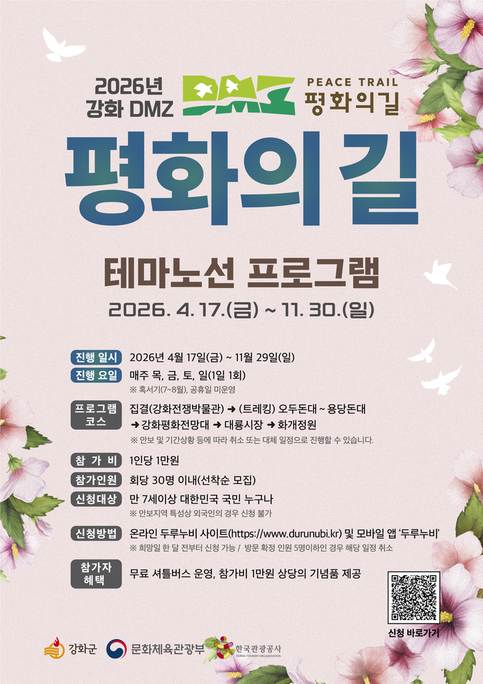 [뉴시니어 = 노태영 기자] 인천시 강화군(군수 박용철)은 17일부터 11월 30일까지 비무장지대(DMZ) 인근을 따라 조성된 DMZ 평화의 길 테마 노선 프로그램을 본격적으로 운영한다고 밝혔다.