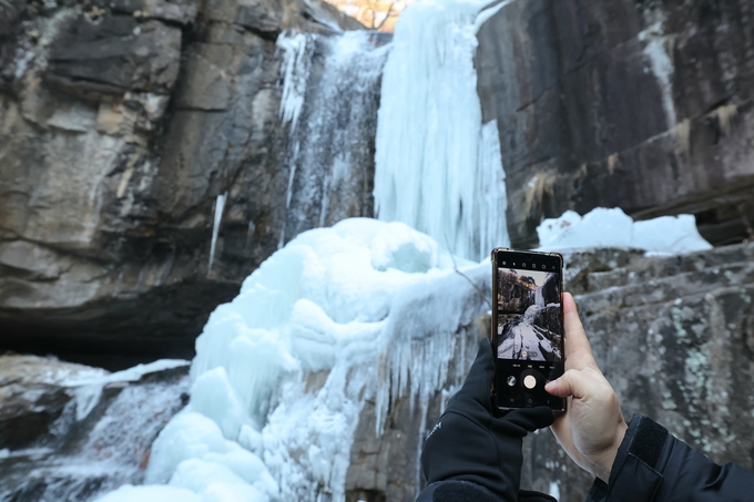 폭포 절벽을 따라 흐르던 물줄기는 얼어붙어 층층이 이어진 얼음 기둥을 형성했고 암벽 곳곳에는 고드름이 달려 웅장한 겨울 풍경을 완성한 가운데 사진 촬영과 겨울 산행을 즐기는 방문객들의 발길이 이어지고 있다.