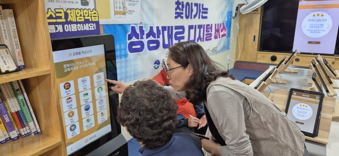 상상대로 디지털버스는 주요 마을을 직접 찾아가 디지털 취약계층을 대상으로 키오스크 체험 등 실생활에 도움이 되는 다양한 교육을 제공하는 이동형 디지털 교육 서비스로 지난해에는 시범운영과 성인문해교육 지원사업을 통해 총 103개의 학습장을 방문, 948명이 참여하며 호응을 얻었다.