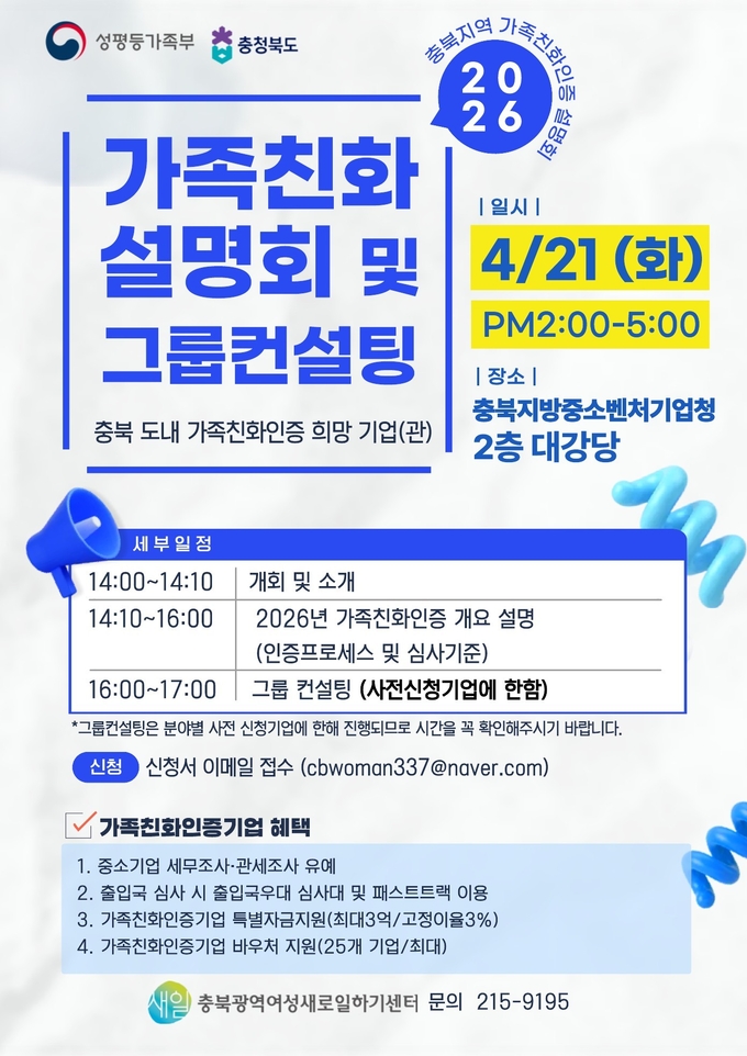 또한, 일과 생활 균형이 가능한 가족친화 인증기업이라는 이미지 제고와 홍보 효과가 커서 매년 가족친화 인증률이 높아지고 있으며, 도는 21일 충북지방중소벤처기업청에서 130여 개사를 대상으로 ‘2026년 가족친화인증제도 충북 설명회’를 개최하며, 시군별 찾아가는 설명회와 컨설팅은 4월 말까지 총 10회 진행할 계획으로 많은 기업이 참여할 수 있도록 지원할 계획이다.