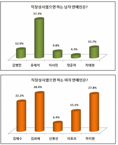 ‘직장상사였으면 하는 남자 연예인’ 1위는 57.3%(540명)를 얻은 유재석에게 돌아갔다. 차태현은 15.7%(148명), 김병만은 12.9%(122명), 이서진은 9.8%(92명)를 차지했고 정준하는 4.3%(41명) 이었다.