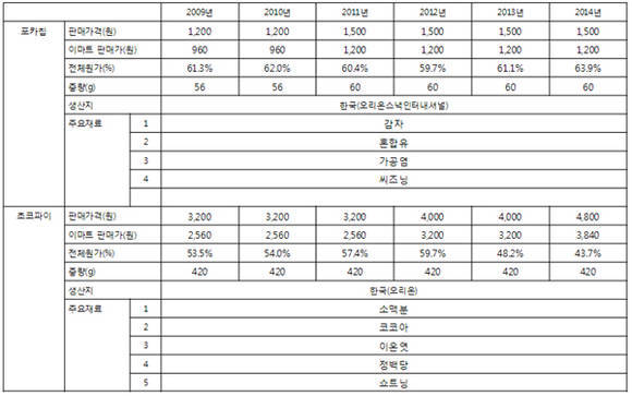 포카칩은 2012년 59.7%에서 63.9%로 원가 비율이 올랐다. 오징어땅콩 역시 2012년 63.1%에서 66.3%로 올랐다.