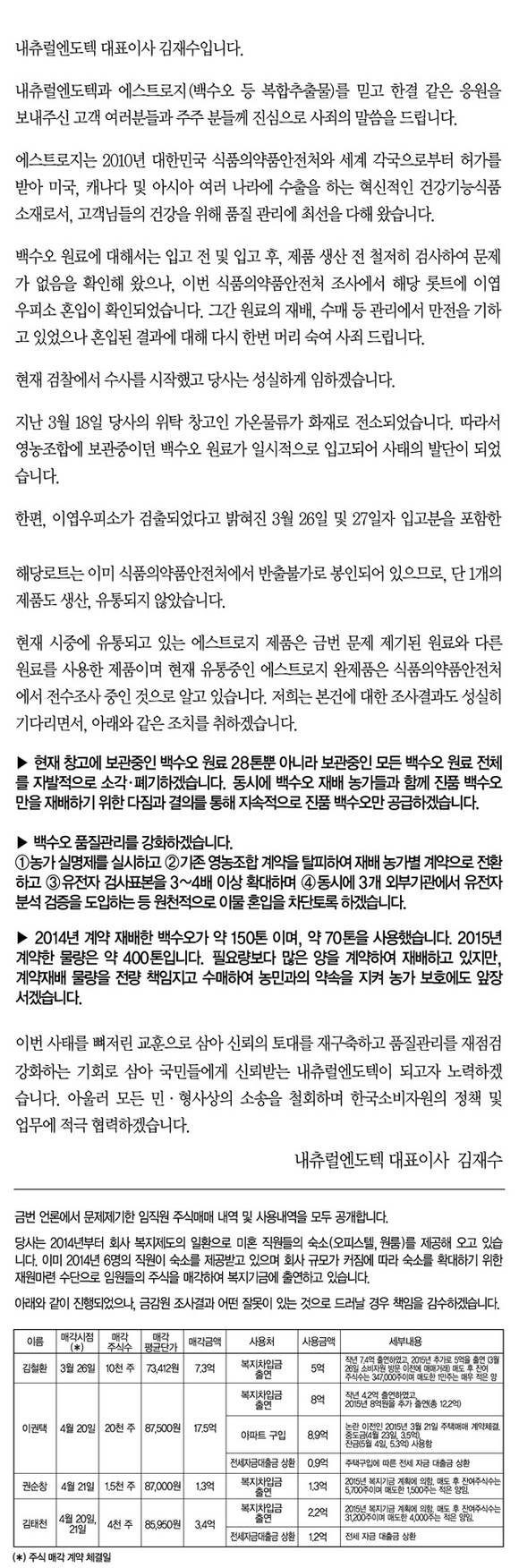 내츄럴엔도텍 '백수오' 관련 대국민 사과문