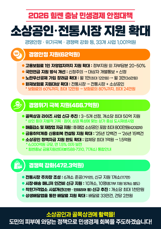 [뉴시니어 = 노태영 기자] 충남도(도지사 김태흠)가 새해를 맞아 소상공인과 전통시장의 경영 안정을 돕고 골목상권에 활력을 불어넣고자 지원 정책을 확대한다.