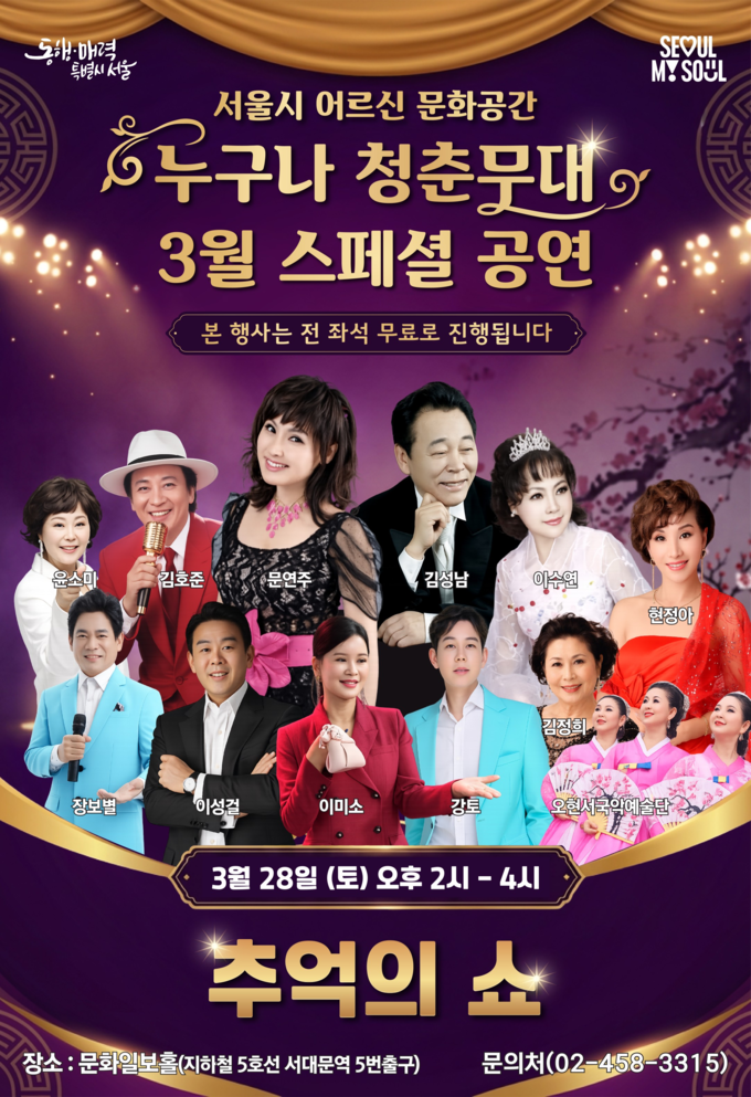 시는 3월을 마무리하는 특별 기획 공연 추억의 쇼를 오는 28일 오후 2시 중구 문화일보홀에서 개최한다고 밝혔다.
