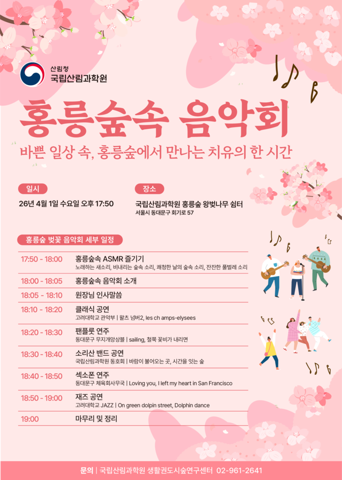 산림청 국립산림과학원 생할권도시숲연구센터 최병기 박사는 “100년의 역사를 품은 홍릉숲이 시민들의 박수와 아름다운 선율로 채워지길 바란다”며 “만개한 봄꽃 아래에서 일상의 고단함을 잠시 내려놓고, 숲이 주는 치유와 여유를 느끼길 바란다”고 밝혔다.