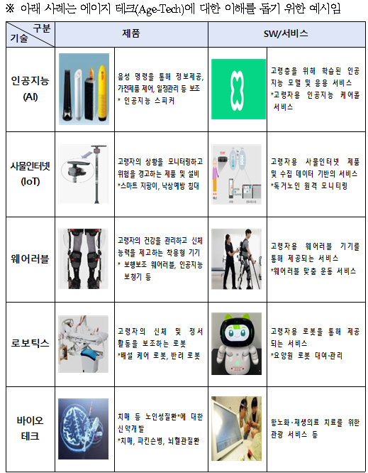 에이지 테크(Age-Tech)는 고령자의 삶의 질 향상을 목표로 AI, 사물인터넷(IoT), 웨어러블, 로보틱스, 바이오 기술 등을 활용한 제품과 서비스를 의미한다. 정부는 고령화로 급증하는 돌봄 수요에 대응하기 위해 해당 분야를 차세대 성장 산업으로 육성한다는 전략이다.