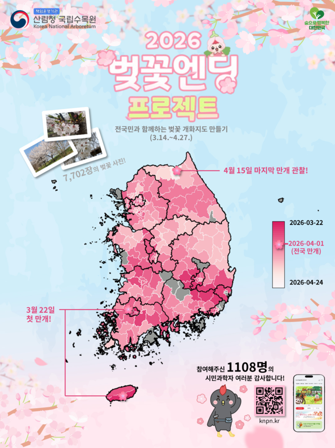 [뉴시니어 = 노태영 기자] 산림청(청장 박은식) 국립수목원(원장 임영석)은 2026년 봄, 시민과학 참여 프로그램 벚꽃엔딩 프로젝트를 통해 국민과 함께 전국 벚나무 개화 현황을 기록하고, 이를 지도 형태로 시각화한 ‘전국 벚꽃 개화지도’를 공개했다고 28일 밝혔다.