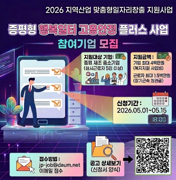 [뉴시니어 = 노태영 기자] 충북 증평군이 지역 제조 중소기업의 고용안정과 장기근속 문화 확산을 위해 ‘2026 증평형 행복일터 고용안정 플러스 사업’ 참여기업을 모집한다고 29일 밝혔다.
