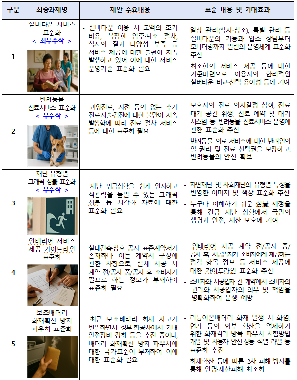우수작(상금 각 50만 원)으로는 두 건이 선정된 가운데 반려동물 진료서비스 표준화는 진료, 위생, 예약 등 반려동물 병원이 갖추어야 할 기본 서비스 기준을 정립하는 아이디어이고, 재난 유형별 그래픽 심볼 표준화는 다양한 재난 상황을 누구든 쉽게 인지할 수 있도록 통일된 심볼 체계를 도입하자는 아이디어다.