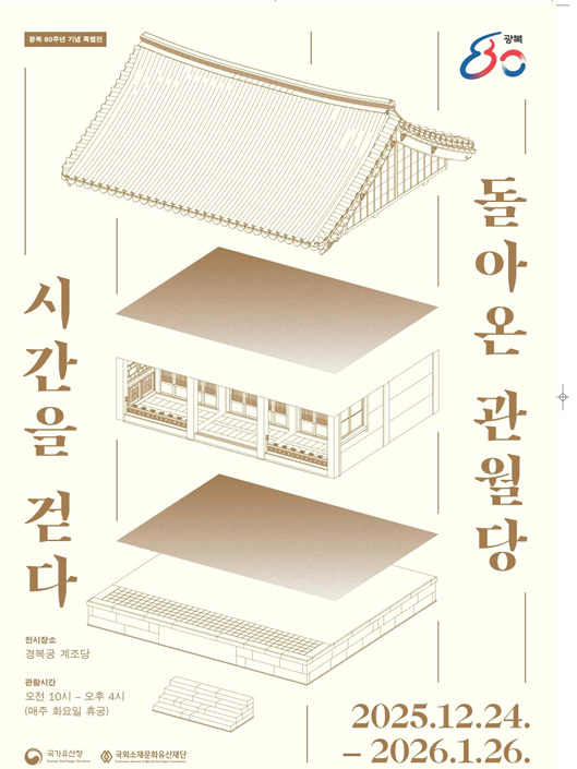[뉴시니어 = 노태영 기자] 국가유산청(청장 허민, 이하 유산청)은 국외소재문화유산재단(사무총장 곽창용, 이하 재단)과 함께 광복 80주년을 맞아 24일부터 2026년 1월 26일까지 경복궁 계조당에서 일제강점기 일본으로 반출되었다가 약 100년 만에 국내로 반환된 조선시대 건축물 관월당(観月堂)의 여정을 조명하는 특별전 돌아온 관월당: 시간을 걷다를 개최한다고 밝혔다.