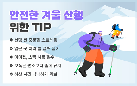 안전한 겨울 산행의 시작은 사전 준비에 있다. 국립공원공단은 산행 전 기상 확인과 체력·건강 상태 점검, 비상식량 준비, 산행 전 가벼운 체조를 안전수칙으로 제시한다. 먼저 등산 전에는 최소 15분 이상 발목•무릎•허리 중심으로 스트레칭을 실시해 경직된 근육을 이완하고 신체 온도를 높여야 한다. 복장은 얇은 옷을 여러 벌 겹쳐 입어 저체온증을 예방한다. 갑작스러운 하산 지체 상황에 대비해 여분의 보온 의류와 고열량 비상식량을 미리 챙기는 것이 좋다.