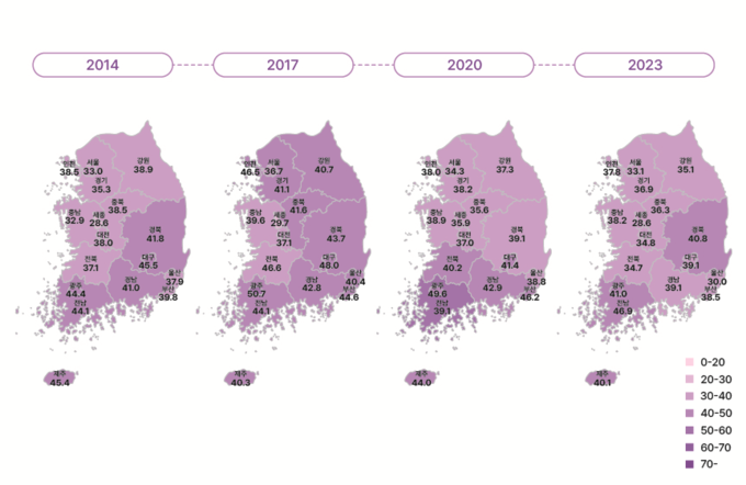 시·도별 심근경색증 연령표준화 발생률(건/10만 명당)은 2023년 전남(46.9건), 광주(41.0건) 순으로 높았고, 세종(30.0건), 서울(33.1건) 순으로 낮았다. 남자는 전남(64.8건)이 가장 높았으며, 여자는 제주(12.1건)이 가장 낮았다.
