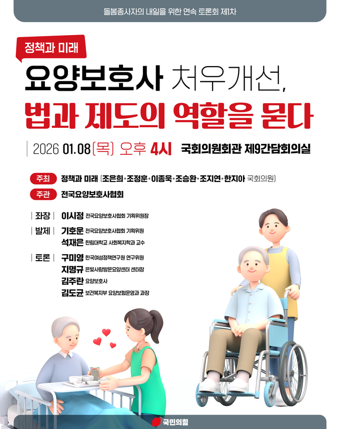 [뉴시니어 = 노태영 기자] 국민의힘 민생 정책 발굴 의원 모임 정책과 미래는 돌봄종사자들의 열악한 처우를 점검하고, 정책적 대안을 모색하기 위해 돌봄종사자의 내일을 위한 연속 토론회를 기획하고 그 첫 번째 주제로 요양보호사 처우 문제를 선정했다.
