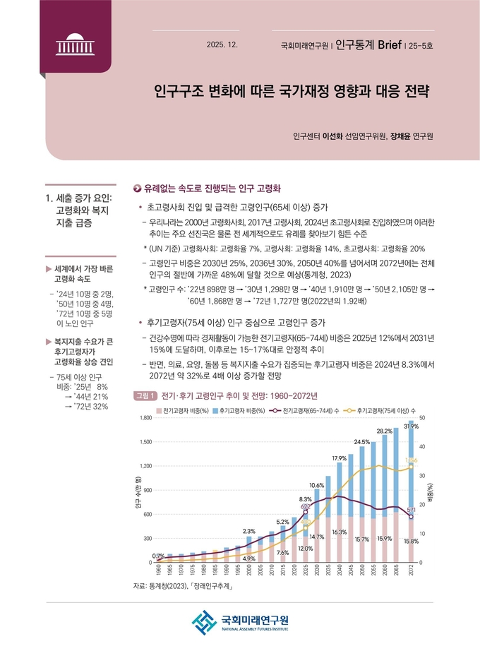 브리프에 따르면, 우리나라의 노인 인구는 2024년에는 인구 10명당 2명 수준이나 2050년에는 4명, 2072년에는 4.8명에 달하며, 의료, 요양, 돌봄 등 복지지출 수요가 집중되는 후기고령자(75세 이상)의 비중은 2072년에 3.2명을 넘어서게 된다.